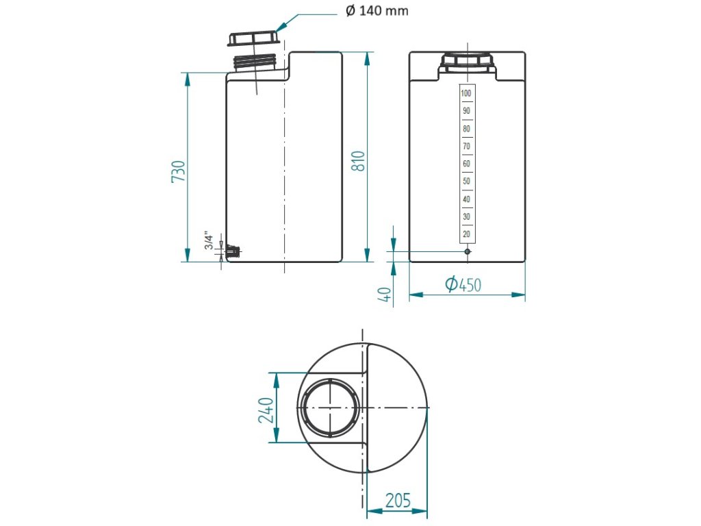 ■ Vlastnosti: šróbovacie veko, litrová stupnica, závitová výpusť 3/4", montážne plochy pre dávkovacie čerpadlo, miešadlo, sondu alebo plavák