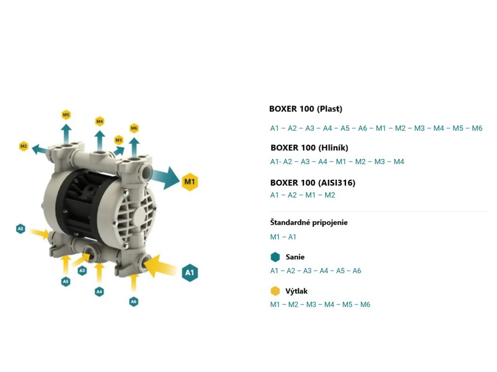 Vzduchomembránové čerpadlo značky DEBEM BOXER v PP vyhotovení s membránami z materiálu PTFE (Teflon) je vhodné na rôzne média - na rôzne kyseliny a zásady s teplotou média do max. 60 °C. Maximálny výkon: 160 l/min.