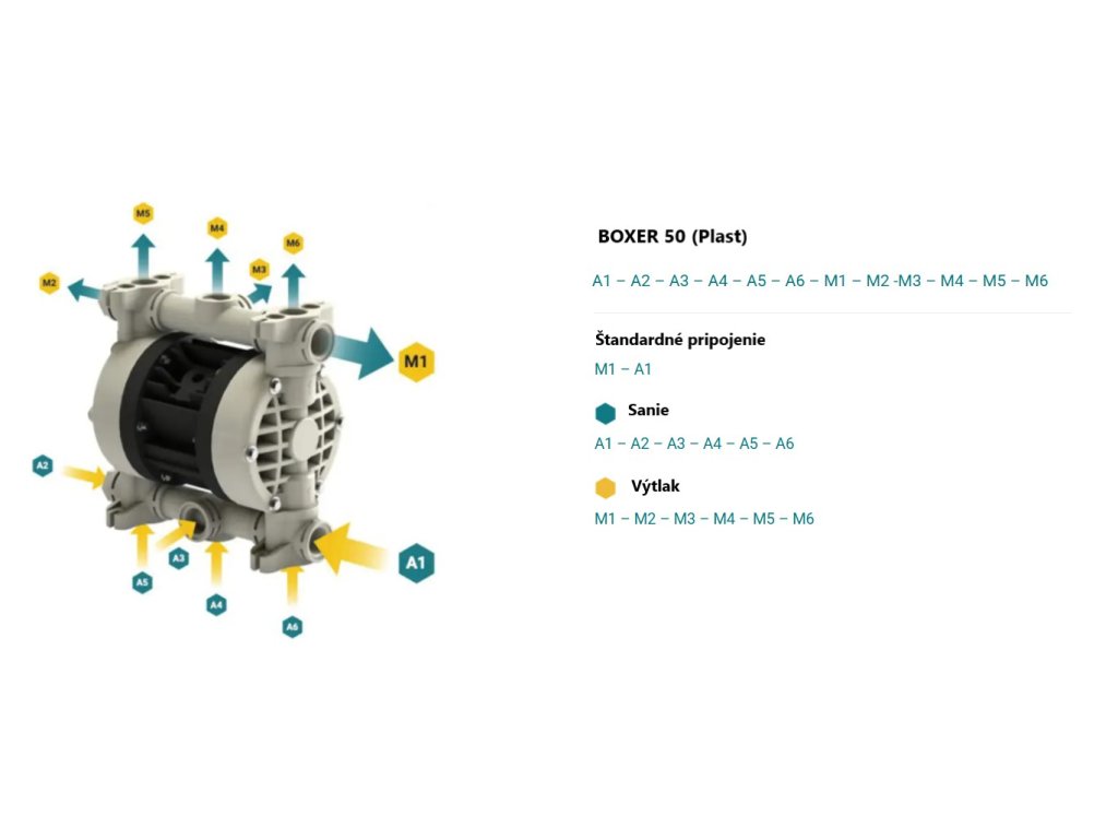 Vzduchomembránové čerpadlo značky DEBEM BOXER v PVDF vyhotovení s membránami z materiálu PTFE (Teflon) je vhodné na rôzne média - na rôzne kyseliny a zásady s teplotou média do max. 90 °C. Maximálny výkon: 60 l/min.