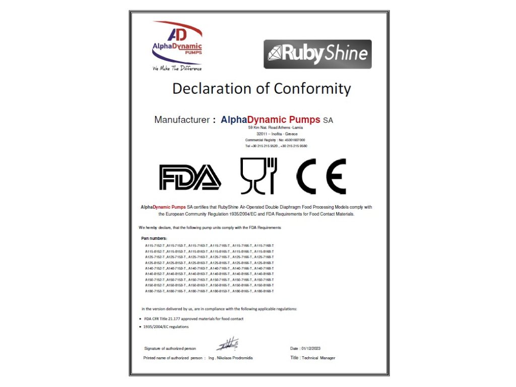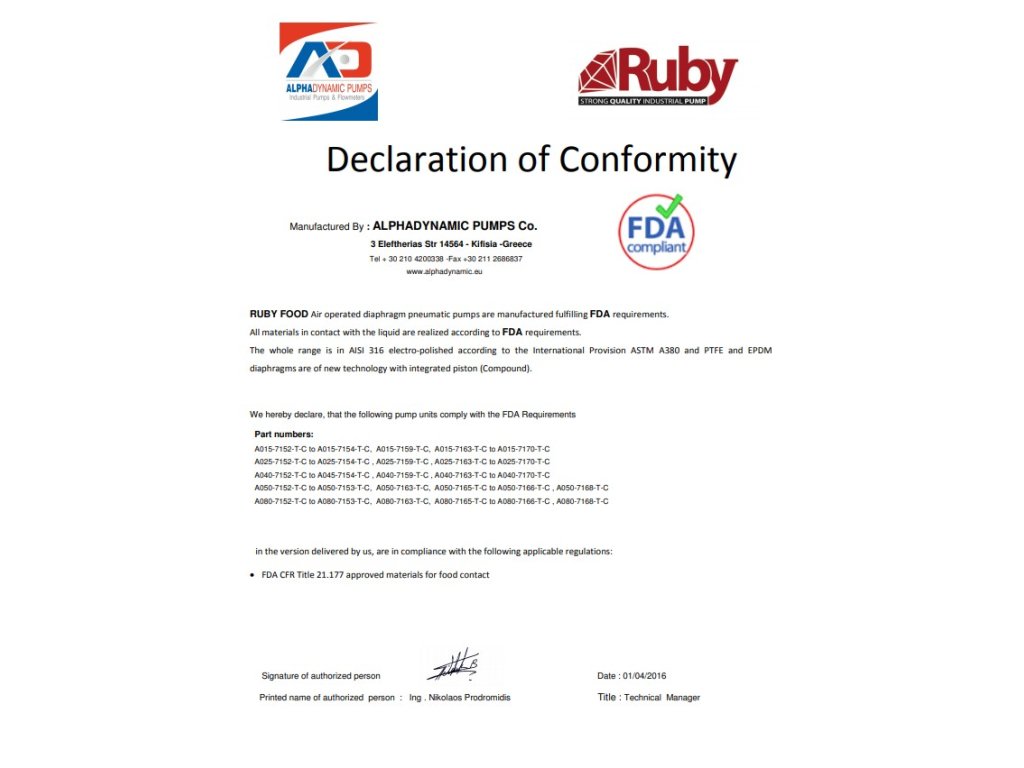 Vzduchomembránové sanitárne čerpadlo značky RUBY v nerezovom (AISI316 leštená Ra 0,8 µm) vyhotovení s membránami z materiálu PTFE (Teflon) je vhodné do potravinárskeho, farmaceutického a kozmetického priemyslu s teplotou média do max. 95°C. Maximálny výkon: 165 l/min. Max. viskozita média: 50 Pa·s (50.000 cps) pri 20 °C