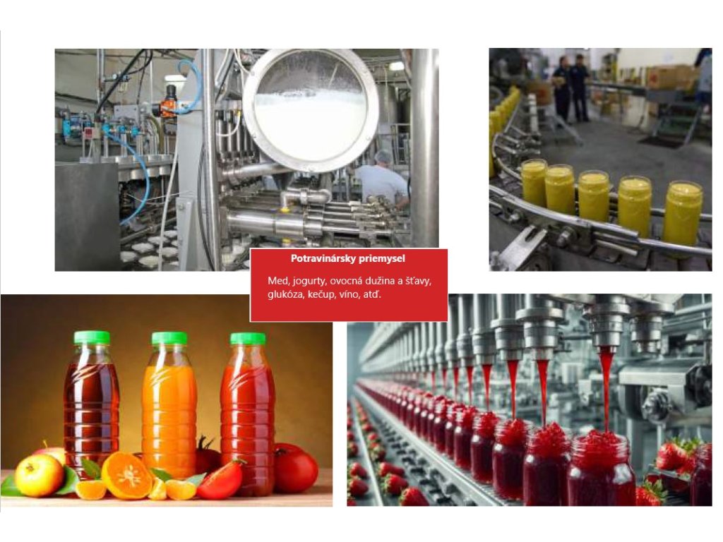 ■ potravinársky priemysel: horčica, kečup, majonéza, paradajky, mlieko, smotana, syry, farbivá, ovocné šťavy, slad, pivo